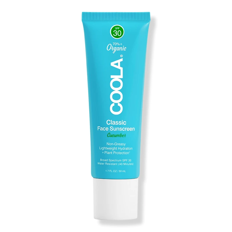 CLASSIC FACE LOTION SPF 30 1.7FLOZ. Benefits: 70%+ certified organic ingredients. Broad Spectrum SPF 30 UVA/UVB protection. 40 minute water resistance. Designed for long active days in the sun, but light enough for daily use. Dermatologist tested. Non-comedogenic. Natural cucumber scent. Gluten Free, Hawaii Reef Compliant (Act 104). Key Ingredients: Avobenzone 1.75%, Homosalate 2.5%, Octisalate 1.5% Octocrylene 3.75%- provides broad spectrum UVA/UVB protection. Plant Protection Complex- featuring naturally effective, antioxidant-rich nutrients - including Red Raspberry Seed Oil, Buriti Oil, Meadowfoam Seed Oil, and Prickly Pear Extract - that help fight free radicals and nourish skin. Safflower Oleosomes- plant-derived encapsulation technology that optimizes the efficacy of Coola's formula. Research Results: 100% agree it's hydrating. 100% agree it's nourishing. 100% agree it felt lightweight. 100% agree it was transparent / had a sheer application. 98% agree it was not sticky or greasy. 96% agree it strengthens and supports skin. in an independent consumer testing panel of 250 participants.