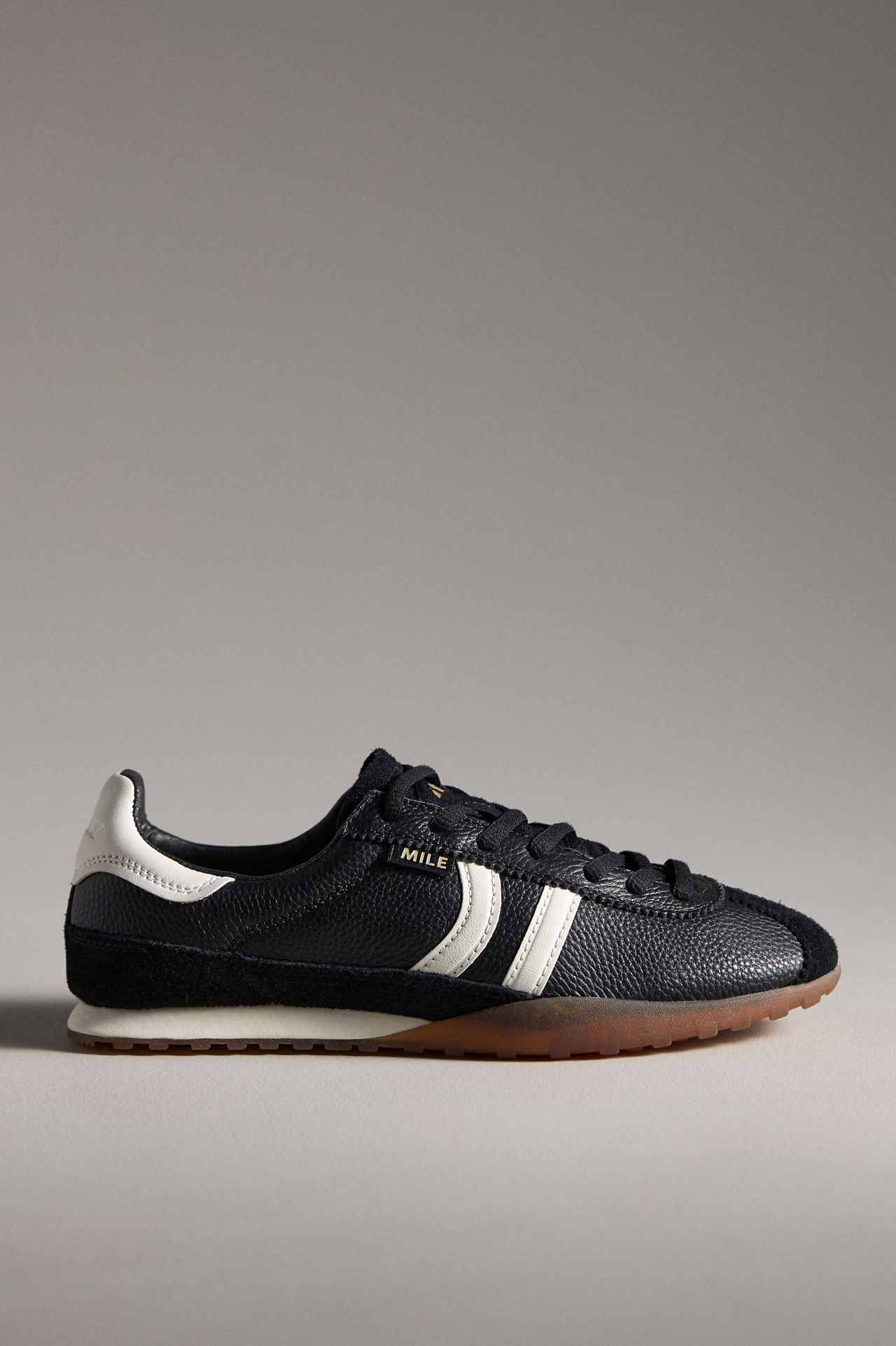 Wrapped in split leather and suede, the Mile is a retro-style sneaker with a thin sole that features contrast color details and the model name on the side in antique gold.