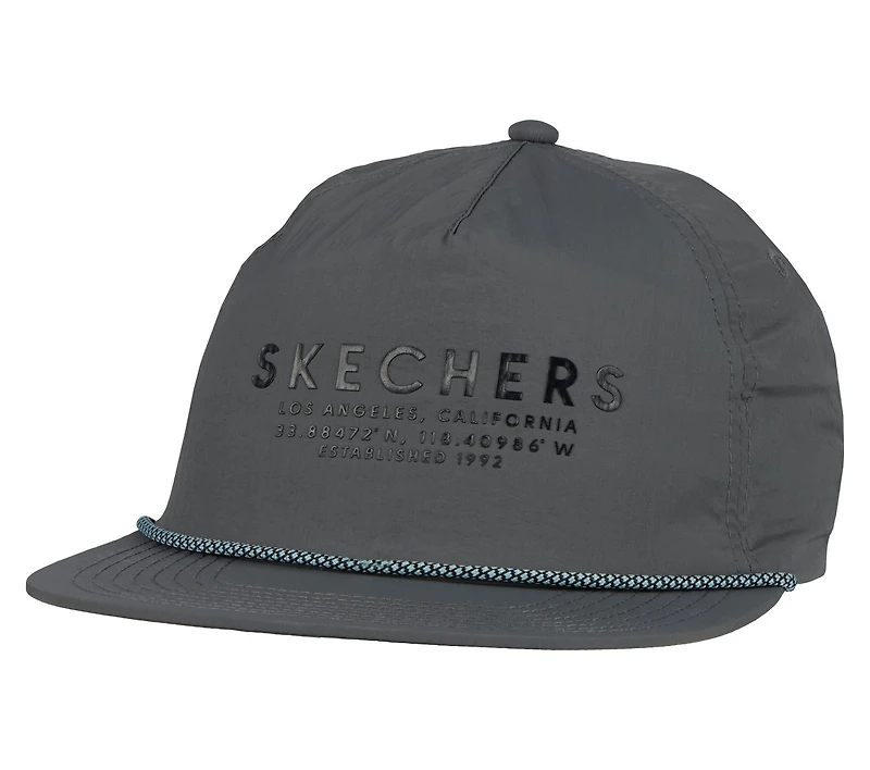 Top off your everyday looks with Skechers Coordinates Hat. This baseball style snapback features a six-panel construction, a flat brim with contrast rope detail, and a tonal Skechers® logo detail with geographic coordinates at the center front.