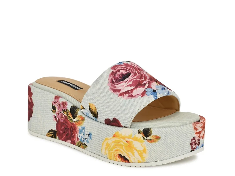 Finish off your favorite summer styles with a fun floral flair! The Copen platform sandals from Nine West features a classic slide silhouette that sits on top of chunky sole for a little bit of lift. Complete with flower details printed throughout the upper.
