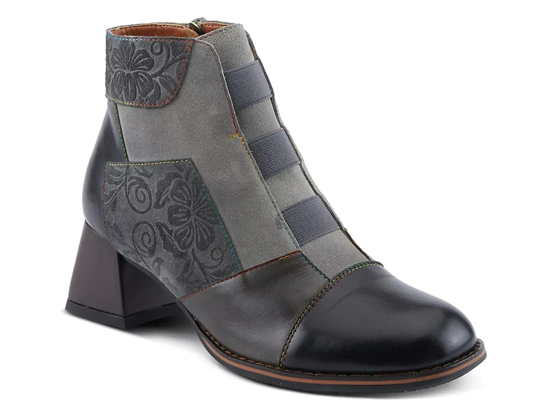 The Copine bootie from L'Artiste might earn you endless compliments. Multicolored leather and suede upper gives a vibrant appeal to the zipper bootie, enhanced with a soft velvet lining for comfort. Triple elastic gore straps in the front offer a secure, cozy fit.