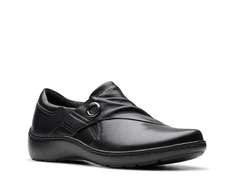 Elevate your casual style with the Clarks Cora Aubrie slip-on. Crafted from leather in a slouchy design, this slip-on comes with molded Cushion Feel footbed for ultimate comfort. Lightweight EVA midsole offers shock absorption.