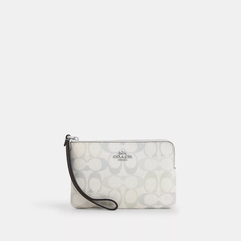 The Corner Zip Wristlet is ready for everyday errands and nights out. With a zip-top closure and a single card slot for simple organization, this small Signature canvas and smooth leather wristlet can be carried as a clutch or worn hands-free with the wrist strap.
