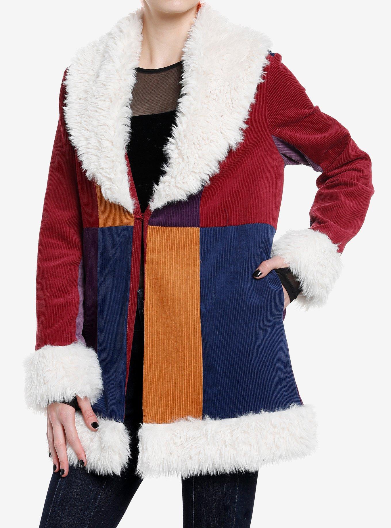 Take your whimsigoth look to the next level with this coat. It features cream-colored faux fur along the hems, and color-blocked corduroy patches in burgundy, purples dark blue and mustard.