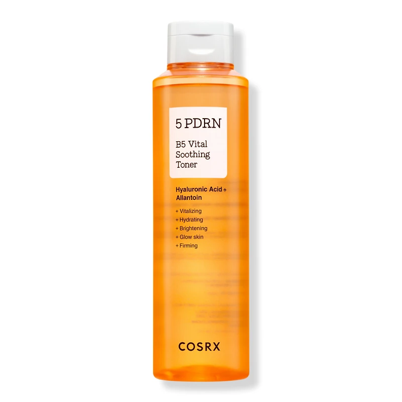 5 PDRN B5 VITAL SOOTHING TONER 9.46FLOZ. Benefits: Repairs and revitalizes damaged skin while strengthening the skin barrier.. Deeply hydrates and locks in lasting moisture.. Brightens dull tone and fades dark spots for a clearer, radiant complexion.. Firms and smooths skin to reduce wrinkles and lift sagging areas.. Refines pores and balances excess sebum for a fresh, even texture.. Key Ingredients: 5 PDRN - Powered by Salmon, Centella Asiatica, Green Caviar, Rice, Lactovacillus. Vitamin B5 - Pantothenic Acid, Panthenol). :
