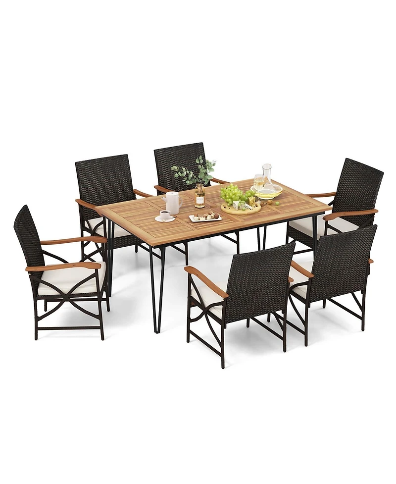 Costway 7 Pcs Patio Dining Set with Acacia Wood Dining Table Rattan Armchairs Soft Cushions