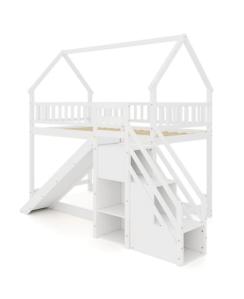 Transform your child's room with our enchanting twin-over-twin loft bed. Designed like a quaint little house and equipped with its own slide, this bed ensures endless fun and creativity. The space underneath? Perfect for storing toys or becoming a secret hideout! It's not just about fun it's also about safety and convenience. Climb up safely using the sturdy staircase—doubling as clever storage with shelves and compartments. No box spring needed, just place any mattress up to 6 inches thick and watch your little one drift into dreamland, surrounded by a protective full-length guardrail. Exhibit practical elegance in your child's bedroom with this house loft bed!