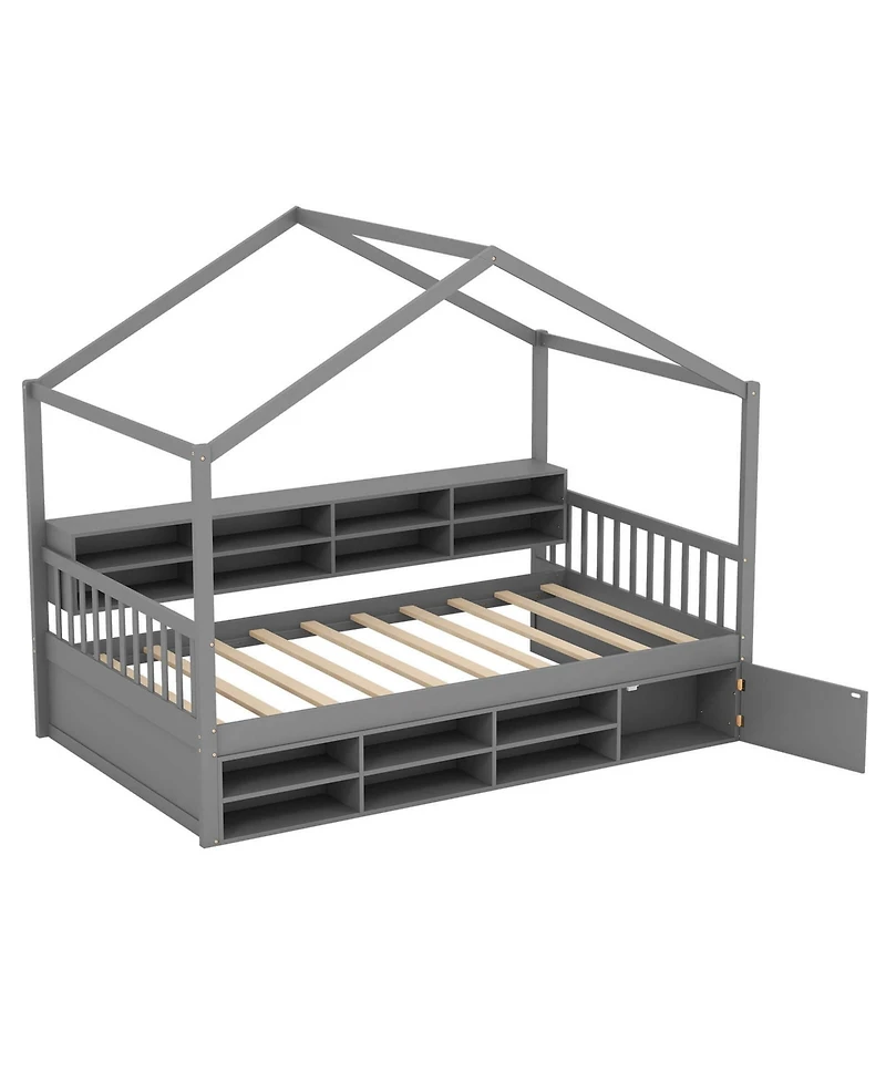 Immerse your child in a world of imagination with the delightful twin house bed frame. The platform bed includes a built-in bedside shelf with 8 storage cubes to ensure your bedroom is well-organized.