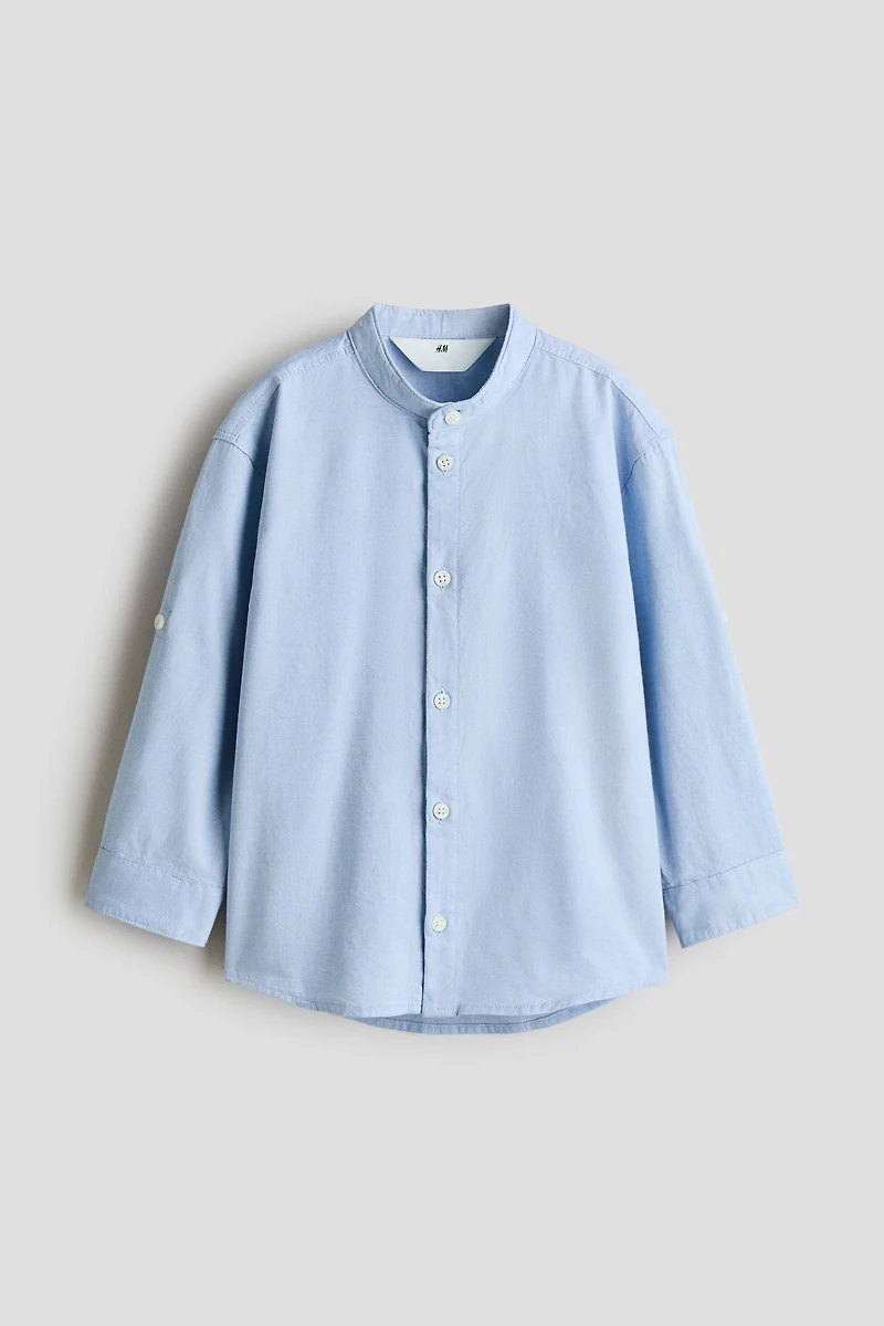 Shirt in soft, airy woven cotton. Band collar, buttons at front, long roll-up sleeves with tab and button, and button at cuffs. Gently rounded hem, longer at back.