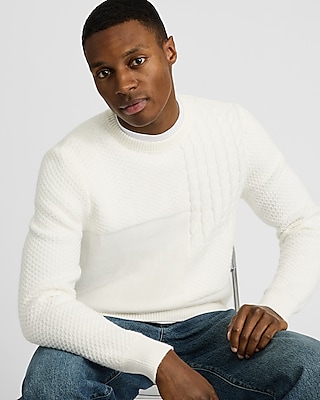 Our twist on a timeless crew neck sweater is crafted from a comfortable cotton-blend, features patchwork textured details and long sleeves.