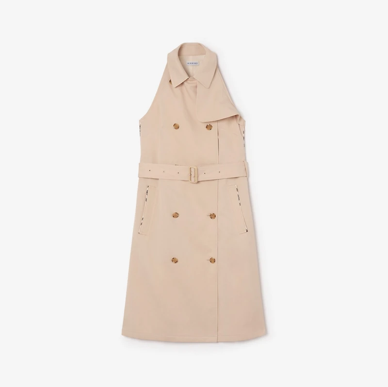 A sleeveless dress inspired by our iconic outerwear, tailored from cotton blend twill. The double-breasted design is finished with Burberry Check piping in timeless taupe brown. Double-breasted button closure Point collar Gun flap Belt Side welt pockets Burberry Check undercollar