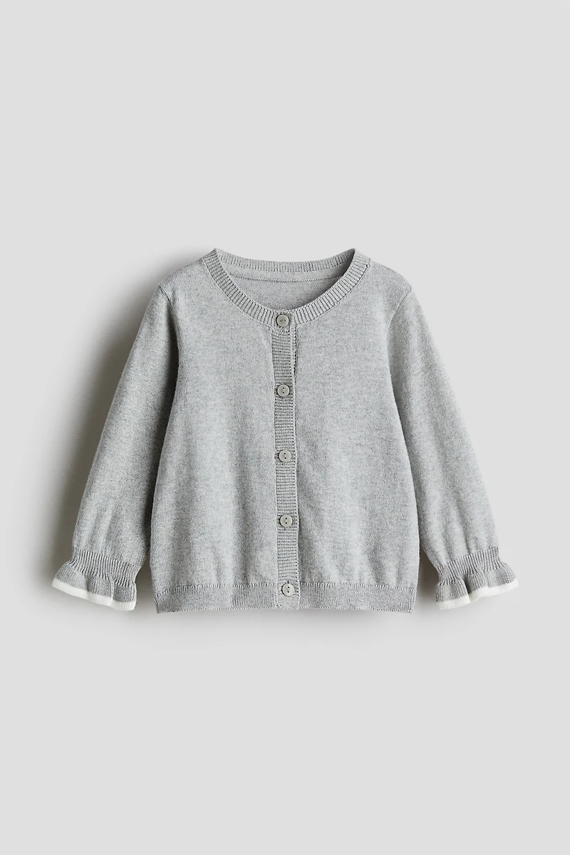 Fine-knit cardigan in soft cotton. Round neckline, buttons at front, and ruffled cuffs. Ribbed neckline, placket, cuffs, and hem.