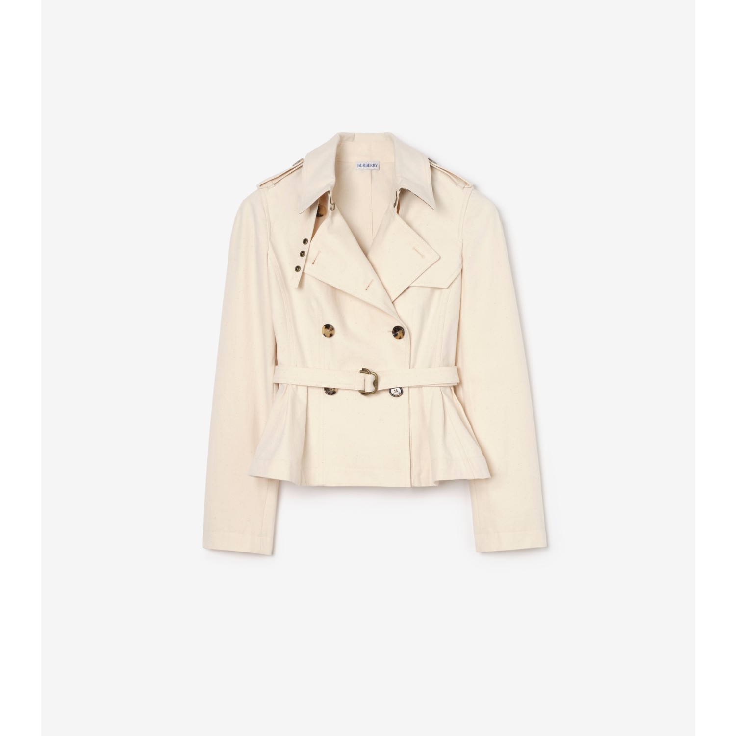 The iconic Burberry trench is recast as a cropped jacket in a midweight textured cotton, washed for a soft finish. The structured silhouette is cut slim at the waist and flares to a peplum hem, with an adjustable B buckle belt in an antique finish. Pop up the collar to reveal a contrasting flash of Burberry Check. Double-breasted button closure Hook-and-bar collar closure Throat latch Epaulettes Storm shield at back Gun flap at shoulder B buckle belt Unlined Burberry Check undercollar Comes with a garment bag