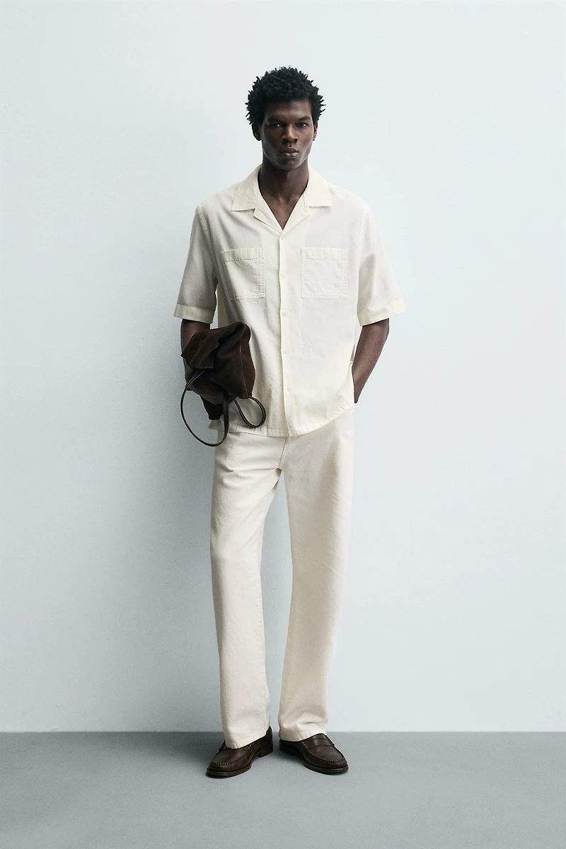 Relaxed fit shirt made of cotton and 17% linen blend fabric. Bowling collar and short sleeves. Patch pockets at chest. Hem with side vents. Front button closure.