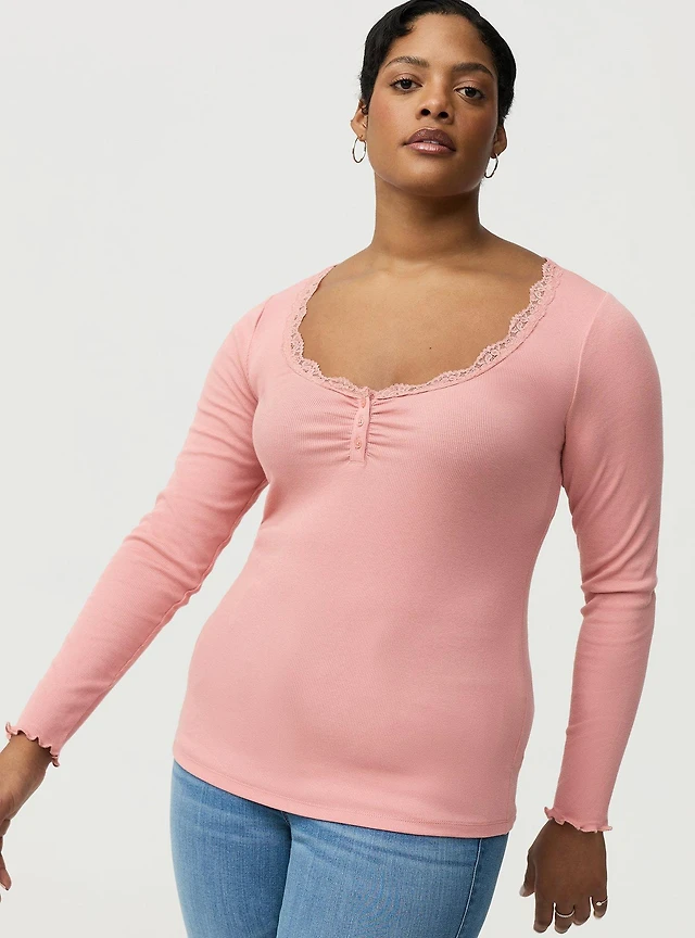 Lucky Brand Women's Valentine Pointelle Trim Rib Henley Top