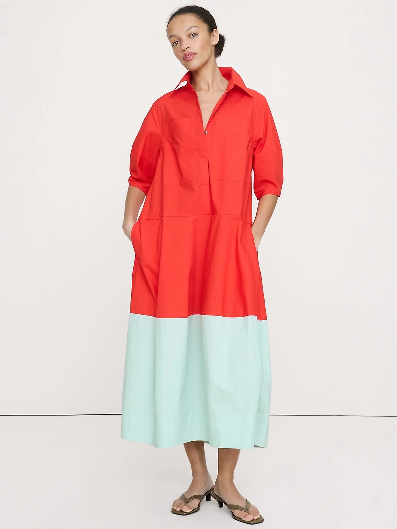 A barrel-shaped twist on the classic shirt dress, we added a color-blocked effect at the skirt as well for an extra dose of optimism. Cut from our signature 100% cotton poplin so it's ideal in all seasons. Barrel fit: Straight through the bust and waist with a flare skirt that tapers towards the hem. Point collar with button front. Chest and side seam pockets. Unlined. Model wears size XS. Barrel fit: Straight through the bust and waist with a flare skirt that tapers towards the hem. Elbow-length sleeves. Midi length. Measurements (from size S): Petite body length: 47" Regular body length: 50"