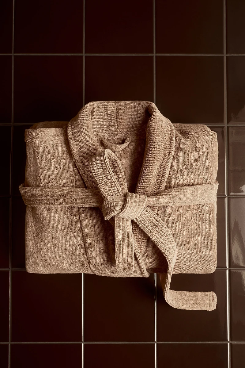 Bathrobe in soft cotton terry. Shawl collar, front pockets, and a removable tie belt at waist.