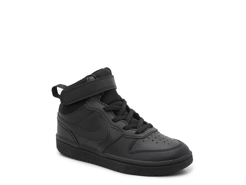 The Nike Court Borough 2 sneaker is designed to maximize your little star's performance on the court. This high-top profile features elastic lace-up panel that acts a secondary closure, padded tongue and ankle and traction outsole.
