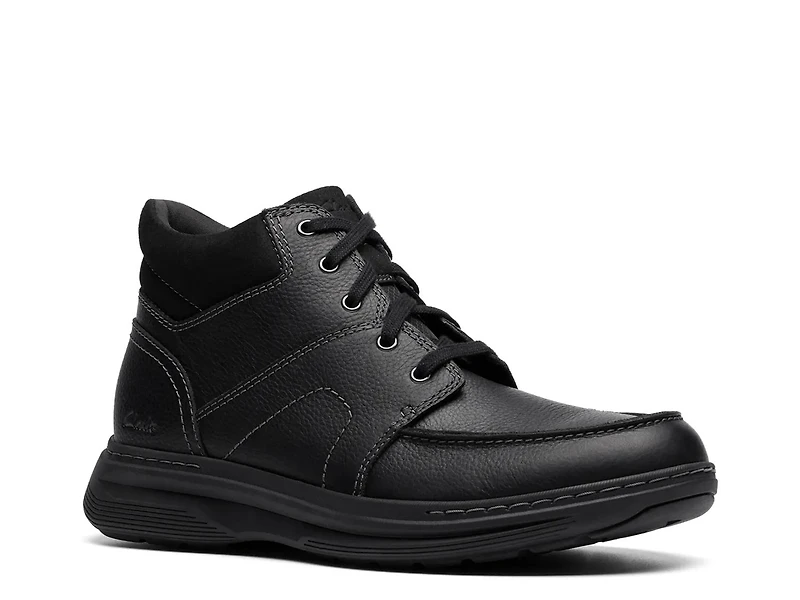 Designed to move with purpose, this heritage-inspired Craftwell Mid boot from Clarks brings rugged style to everyday wear. Crafted from premium leather, it blends Clarks comfort with modern functionality. A molded footbed and padded lining support each step, while its lightweight EVA midsole and durable rubber inserts at heel and toe absorb impact and enhance grip.