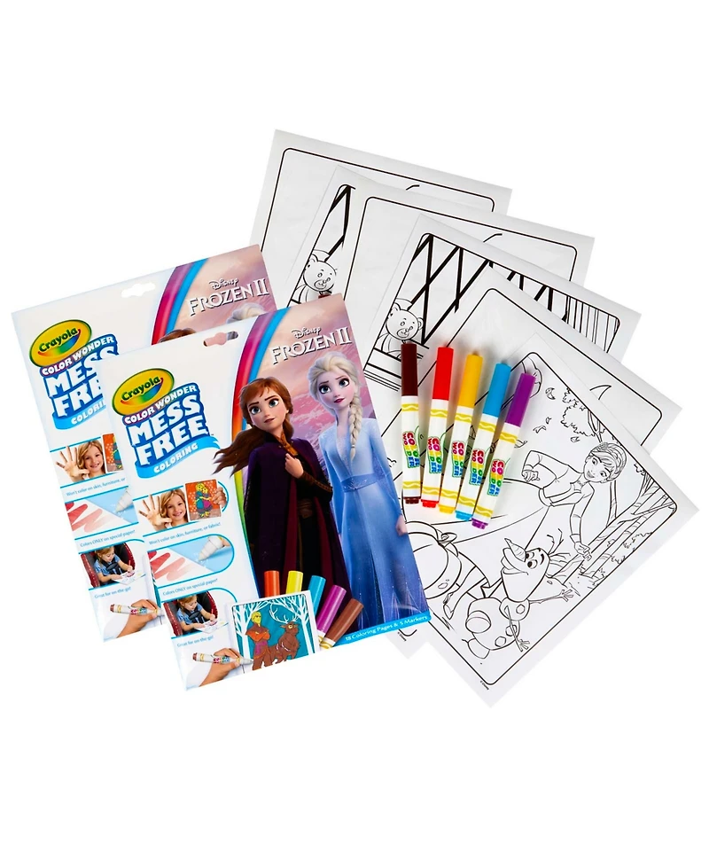 Bring home the joy of Disney's Frozen 2 with a mess free coloring experience. Color Wonder Markers only show up on specially formulated Color Wonder Paper, so there are no stains on skin, clothing, or furniture. Each set contains 5 Mess-Free Markers and 18 Coloring Pages. Sold as a pack of 2 complete sets.
