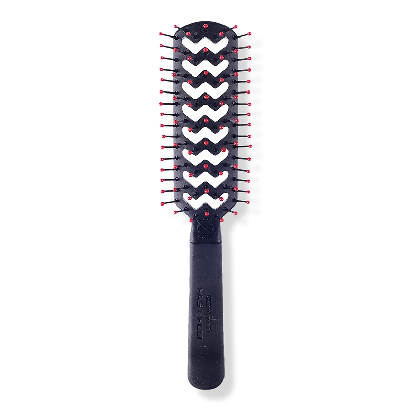 STATIC FREE FAST FLOW BRUSH XX. Features: Strategic vent pattern design that maximizes the hair dryer airflow, to accelerate hair drying time and overall styling. Non-snag bristles and reinforced stay-put ball tips for hairstyling comfort. Non-slip handle grip for styling control. Benefits: Eliminate and remove static from hair. Accelerates hair drying and styling time. The pro hairstylist must-have brush. The original inventor of the "static free" brush. Designed in the USA. :