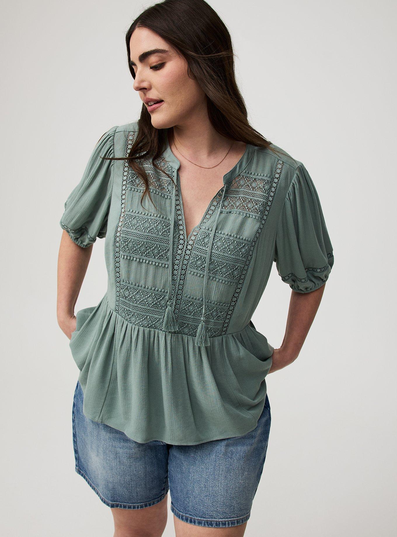 FIT Measures 28"" from shoulder (size 2). MATERIALS + CARE Crinkle Gauze woven fabric: Lightweight, textured, breathable and still totally opaque. Stretch level: None. 74% rayon, 26% polyester. Machine wash cold. Tumble dry low. Imported. DETAILS V-neckline. Short sleeves. Lace accents. Tassel details.
