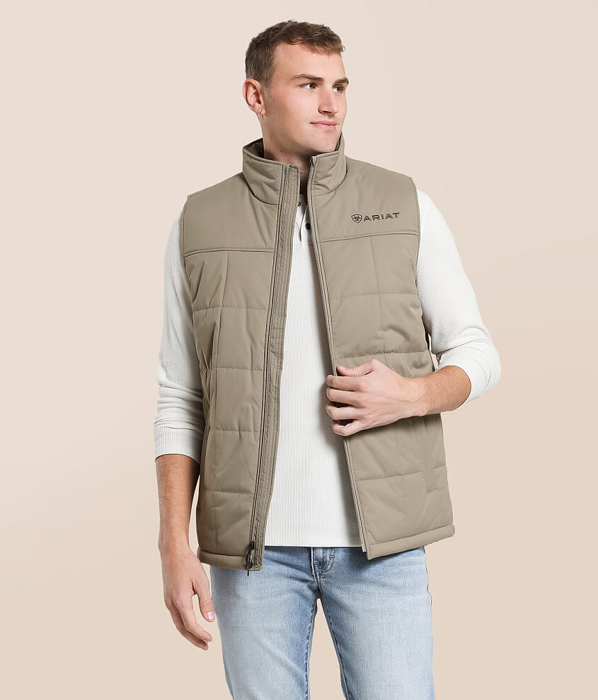 Embroidered logo zip front puffer vest Velour lining Interior zipper pocket Cinch tie hem Wind and water resistant Compact/sub-compact interior zipper carry holster