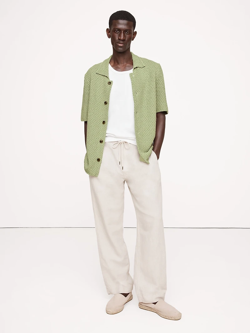 We wanted this shirt to capture the feel of the best handmade pieces so we chose a fabric that mimics the look of true crochet, in 100% certified-organic cotton. Pair with the matching shorts to make it a set. Relaxed fit: Relaxed fit through shoulders, chest and waist with dropped shoulder seam. Polo collar with button-front closure. Straight hem with vented sides. Relaxed fit: Relaxed fit through shoulders, chest and waist with dropped shoulder seam. Short sleeves. Hits at the hip. Model: Size M, 6'2"