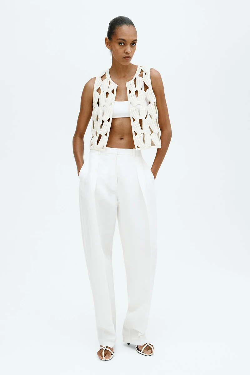 Short, sculptural knit vest in a crochet-look cotton blend. Round neckline and open front. Unlined.