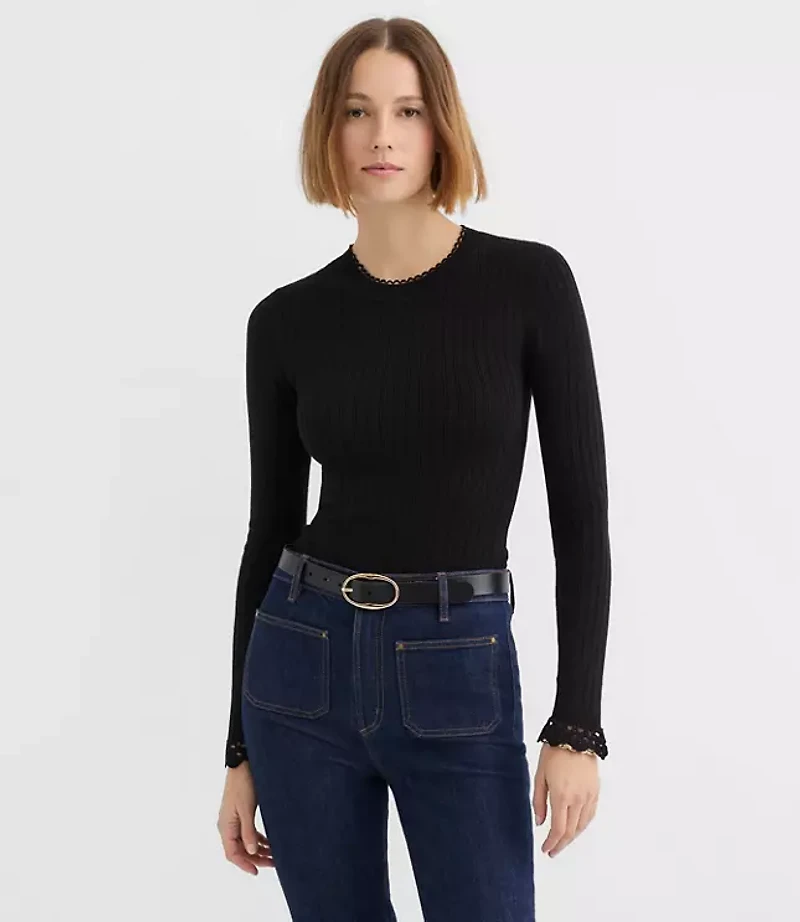 From its scalloped crochet neckline and cuffs to its chevron pointelle motif, this soft knit is all about the sweetest details. Crew neck Long sleeves, Bullet1: Sweater weight Lightweight, Hit: Hits at hip, Imported:, Length: 22"long, Fabrication: 82% Viscose 16 Nylon 2 Spandex, Garment Care: Machine Washable Loft Crochet Trim Pointelle Sweater Size 2XS Black Women's by Loft Size Regular - 2XS Black Women's Crew, Neck Long Sleeve Pullover Sweaters Wear To Work 82% Viscose 16% Nylon 2% Spandex Machine Washable Best Fall Sweaters
