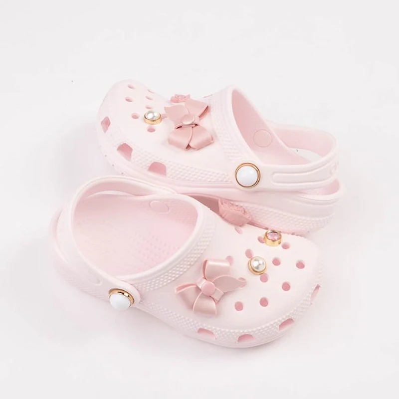 Step into sweet standout style with the crocs classic shimmer bow clog in bubble ice. This playful clog features lightweight croslite™ foam construction with shimmery bow and floral jibbitz™ charms for a dressy twist. available exclusively at journeys kidz.