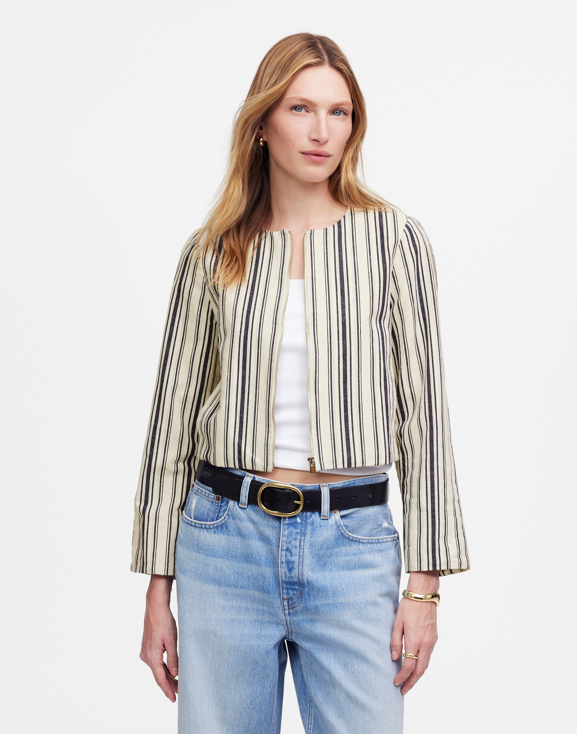 A striped cardigan-style jacket designed with a zippered front and cropped length. Crafted from a lightweight blend of cotton and linen, try this easy-to-style piece with jeans or white pants.