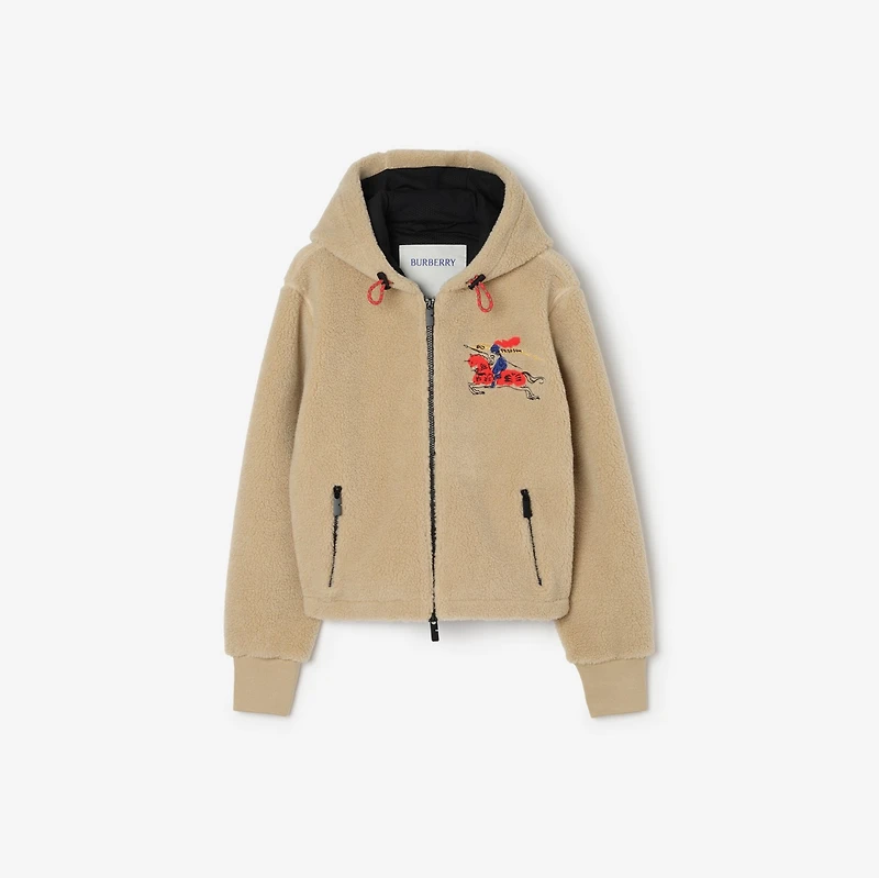 A hooded jacket in a soft wool cashmere blend fleece, embroidered with our Equestrian Knight Design. Created as part of our Year of the Horse capsule, the artwork playfully reimagines our house code in textural and metallic threads. The style is lined with lightweight mesh and is cut to a regular fit with a cropped length. Two-way zip closure Side zip pockets Drawcord hood Rib-knit cuffs Embroidered Equestrian Knight Design at chest and back