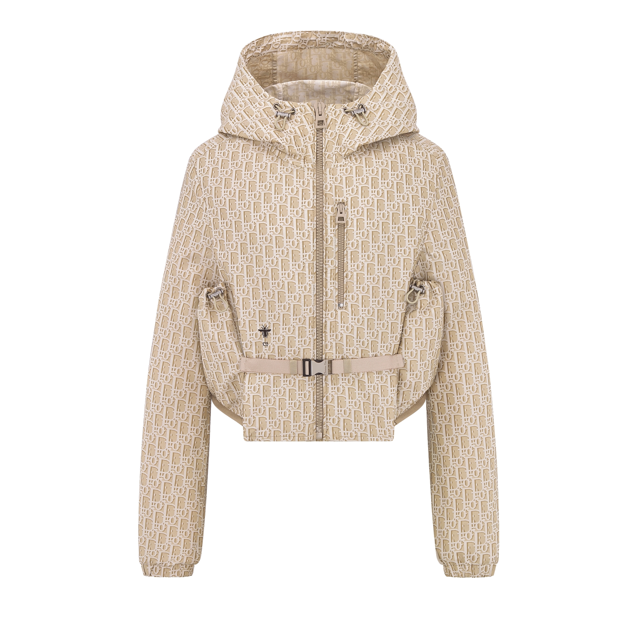 The hooded cropped jacket showcases the iconic Dior Oblique motif. Crafted in beige technical jacquard taffeta, it features a zip closure, two large flap pockets and a zipped chest pocket. The style is completed by a utilitarian-inspired integrated belt and Christian Dior band on the back. The laid-back jacket can be paired with other Dior Oblique creations. Embroidered hallmark bee and CD signature. Christian Dior band on the back. Integrated belt with utilitarian-inspired buckle. Unlined. 100% polyester. Made in Italy
