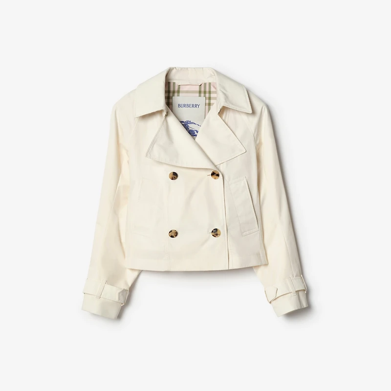 Inspired by our iconic trench, the cropped Ladybrook jacket is cut from lightweight cotton with a soft finish and shaped to a slim fit. Raglan construction gives a softer line at the shoulders, opening to wide balloon sleeves. Inside is a partial Burberry Check lining in a soft mallow pink colourway. Double-breasted button closure Hook-and-eye collar closure Leather buckle cuffs Side welt pockets Burberry Check lining and undercollar Comes with a garment bag