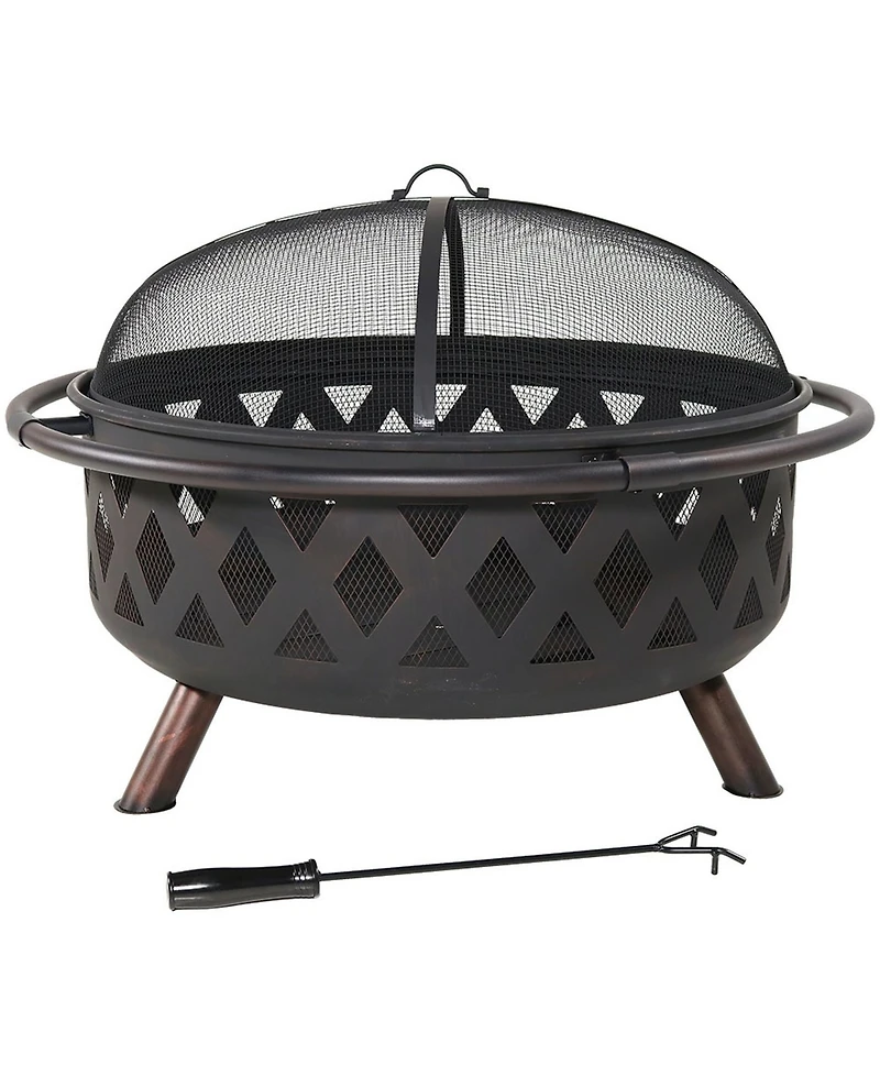This firepit for outside provides ample room for a bonfire with family and friends on any patio, yard, or campsite. The overall fire pit is accented with a decorative crossweave pattern that glows at night to add style and charm to any outdoor space. This round fire pit comes with a mesh spark screen to keep flying embers contained and a log poker to easily maneuver the wood inside the pit safely. It also includes a weather-resistant cover to protect the fire pit from exposure to the elements when not in use. This wood-burning fire pit for outside is not designed to burn on a deck unless a fireproof pad is used. Enjoy this sturdy steel fire pit in any backyard or patio today.