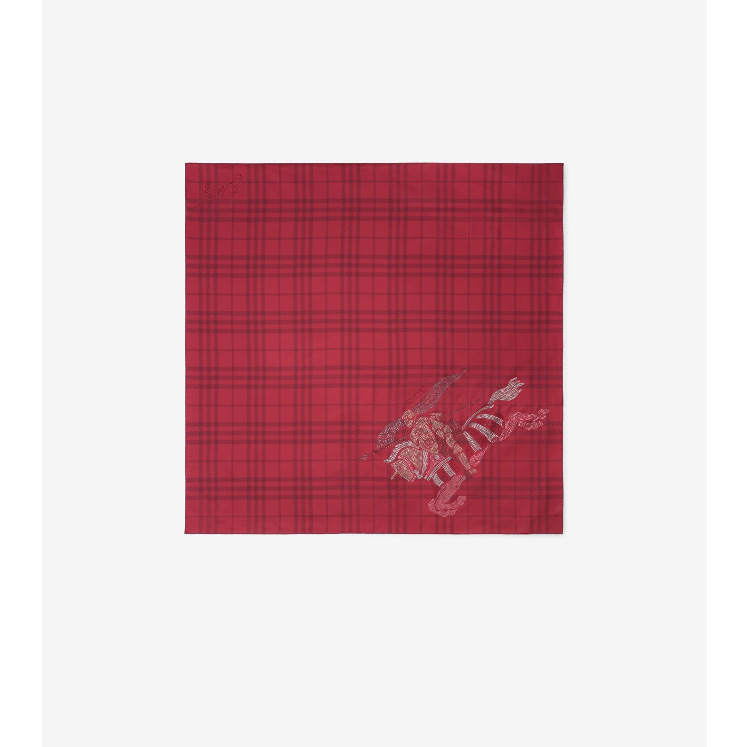 An Italian-made scarf in silk twill, digitally printed with the Burberry Check in vibrant ripple red. The design is embellished with light-catching crystals in the shape of our logo and Equestrian Knight Design. Square Hand-rolled edges