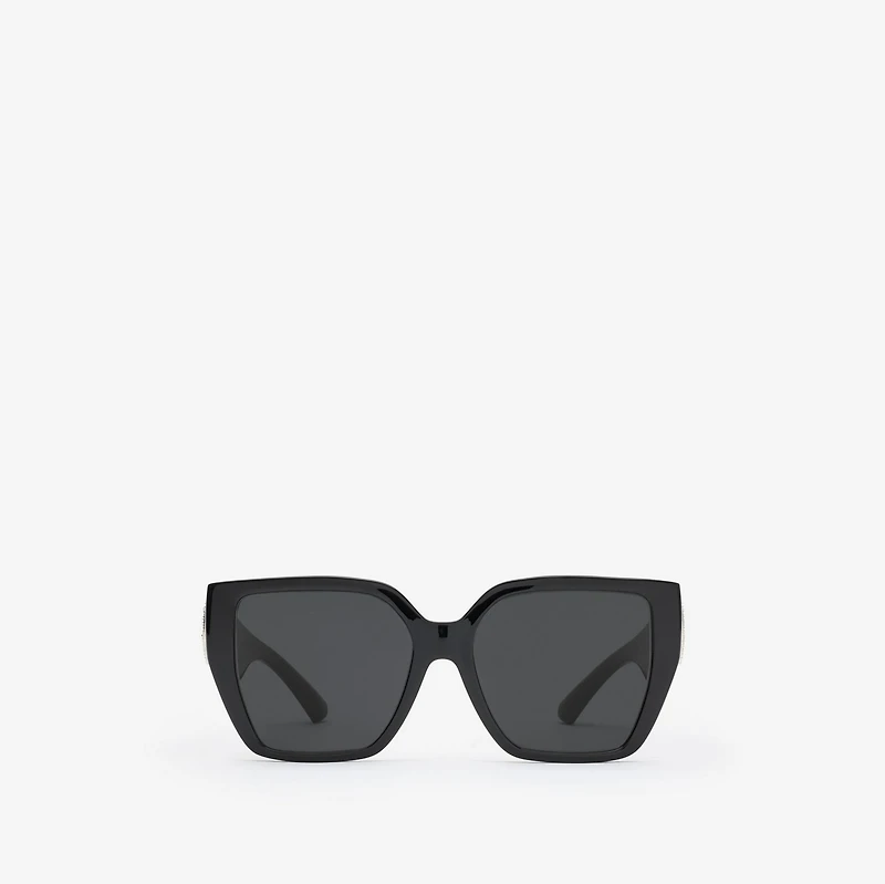 A pair of square sunglasses made in Italy from glossy nylon. The wide sculptural temples feature a cut-out Equestrian Knight Design motif dotted with purple crystals. Scratch-resistant dark grey lenses with 100% UV protection Printed Burberry lettering at temples Comes with a leather case and cleaning cloth