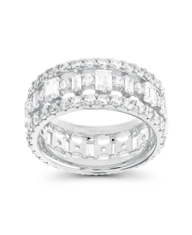 Bold in design, this eternity ring features a trendy combination of emerald cut and round sparkling white cubic zirconia.