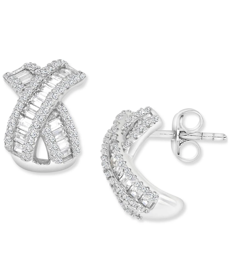 The alluring sparkle of cubic zirconia is showcased with elegance in these round and baguette crossover curved stud earrings.