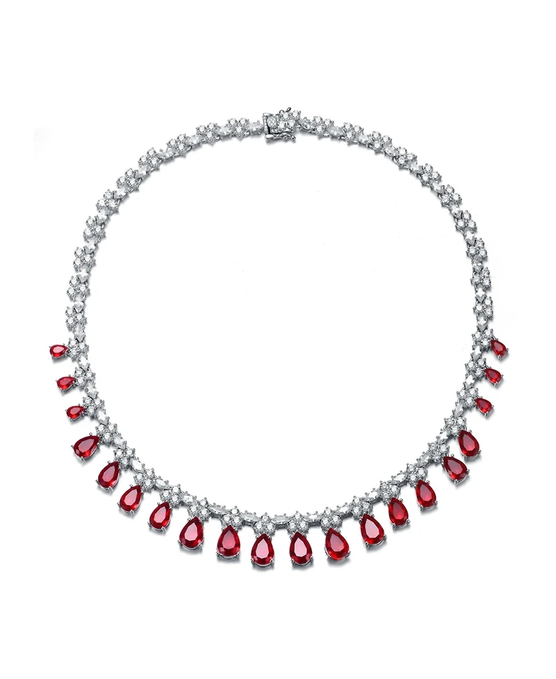 Capture the essence of timeless luxury with this breathtaking fringe-style necklace, a masterpiece designed to turn heads at your next special event. Expertly crafted in shimmering sterling silver and finished with a premium White Gold Plating, this piece features a rhythmic sequence of brilliant round and marquise-cut cubic zirconia that leads to a dramatic display of pear-shaped drops. Whether you choose the classic clarity of clear or a vibrant pop of green, royal blue, red, or romantic pink, this necklace provides the high-end look of fine jewelry with a versatile, modern edge. It s more than an accessory it s a statement of sophistication that illuminates the neckline and elevates any formal ensemble to red-carpet status.• Premium White Gold Plated• High-Quality Sterling Silver• Top Grade Cubic Zirconia• Genevive Accessible Opulence