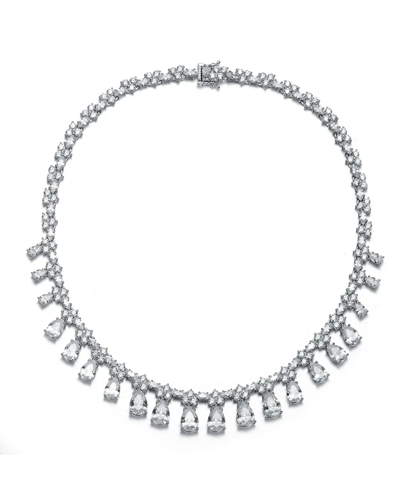 Capture the essence of timeless luxury with this breathtaking fringe-style necklace, a masterpiece designed to turn heads at your next special event. Expertly crafted in shimmering sterling silver and finished with a premium White Gold Plating, this piece features a rhythmic sequence of brilliant round and marquise-cut cubic zirconia that leads to a dramatic display of pear-shaped drops. Whether you choose the classic clarity of clear or a vibrant pop of green, royal blue, red, or romantic pink, this necklace provides the high-end look of fine jewelry with a versatile, modern edge. It s more than an accessory it s a statement of sophistication that illuminates the neckline and elevates any formal ensemble to red-carpet status.• Premium White Gold Plated• High-Quality Sterling Silver• Top Grade Cubic Zirconia• Genevive Accessible Opulence