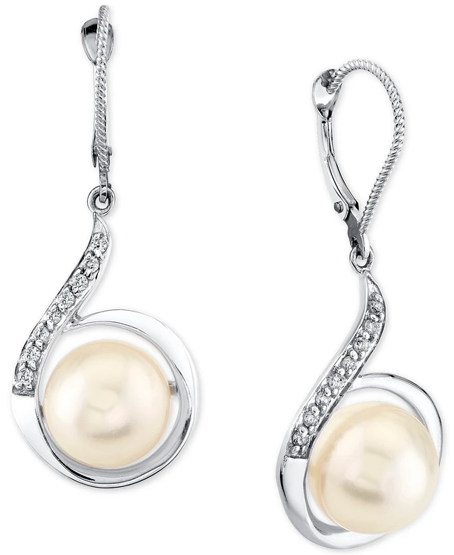 Cultured Freshwater Pearl (10mm) & Diamond (1/6 ct.t.w.) Swirl Leverback Drop Earrings in 14k White Gold