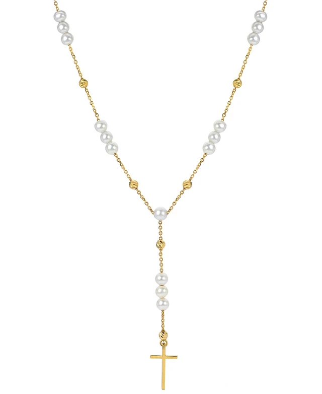 Cultured Freshwater Pearl (4 - 4 1/2mm) Cross 18" Lariat Necklace in 14k Gold-Plated Sterling Silver