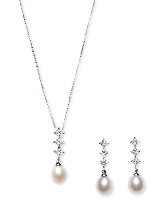 Cultured Freshwater Pearl (7 x 9mm) & Cubic Zirconia Pendant Necklace & Drop Earrings Set in Sterling Silver, Created for Macy's