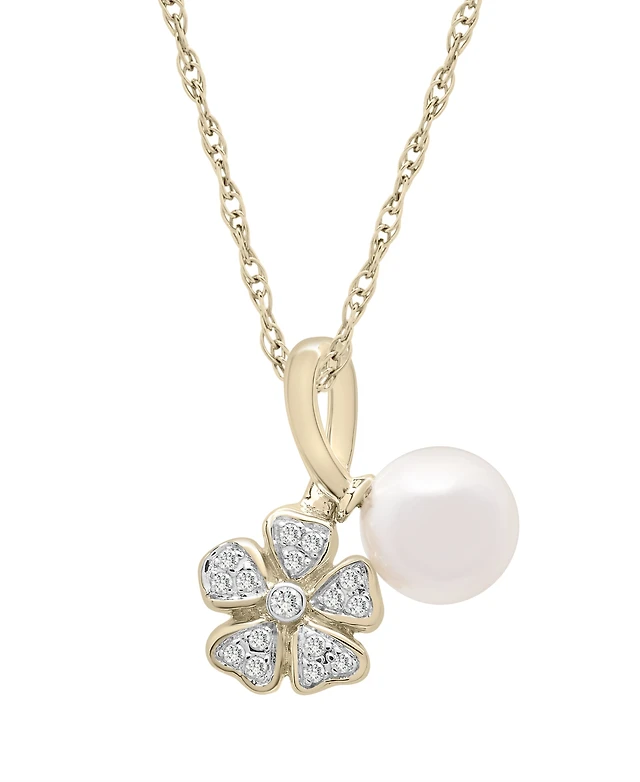 Cultured Freshwater Pearl with Diamond Flower Pendant Necklace in 14K Yellow Gold