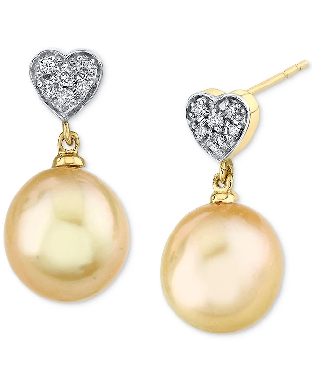 Cultured Golden South Sea Pearl (9mm) & Diamond Heart (1/10 ct. t.w.) Drop Earrings in 14k Gold