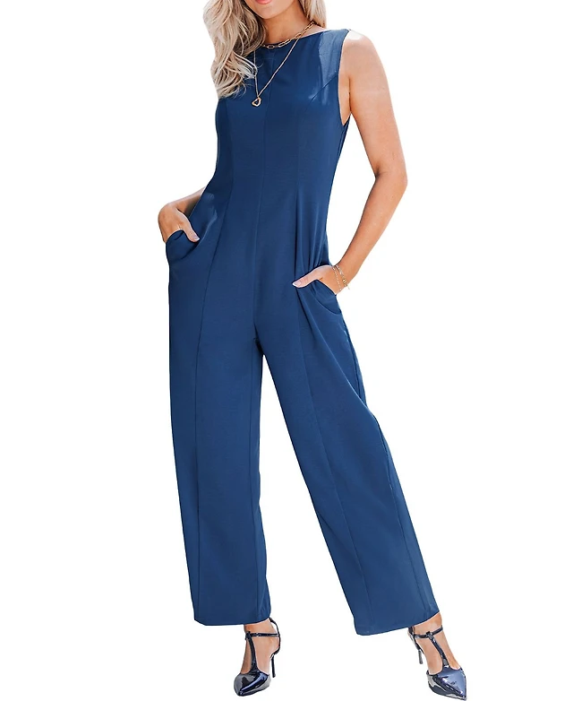 Cupshe Women's Navy Smocked Waist Wide Leg Jumpsuit