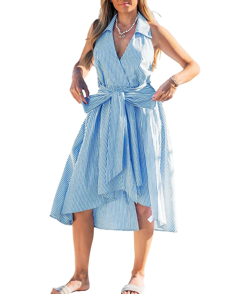 Elevate your resortwear with this breezy sleeveless midi dress. It features a chic collared V-neckline and a halter-style back tie. A prominent front tie accentuates the waist, leading into a flowing A-line skirt with a modern asymmetrical hem. Crafted from lightweight, opaque woven fabric, this unlined dress is perfect for sunny days. Product Code: DAA05A5M005CT