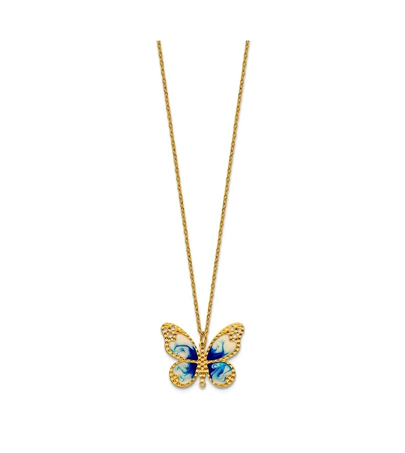 Curata Jewelry Solid 14k Yellow Gold 18 Inch Italian Blue Enamel Textured Butterfly Necklace